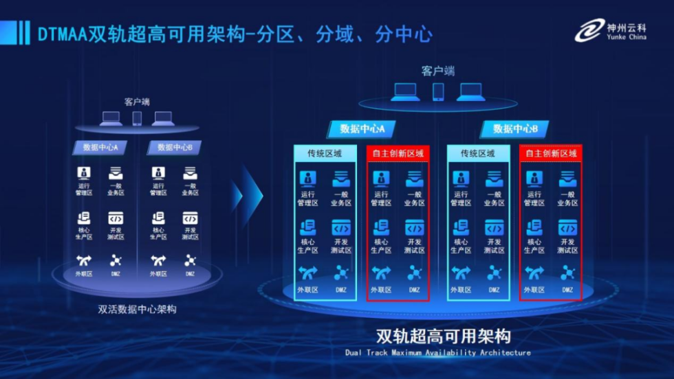 为帮助金融客户更好地应对数字经济时代对可持续性的高要求,实现“信创”与“数字化”齐头并进,mile米乐集团推出了双轨超高可用架构。该架构在双活数据中心的分区调度基础上,增加信创域和非信创域的分域调度,实行信创域与传统域应用全量部署,使双中心运营变为双中心四区域并行运行,互为多活,将“0到1”的单轨建设道路变为分区分域协同的多活双轨超高可用架构。帮助客户在新架构下,保障“信创”的同时解决性能瓶颈,提升稳定性,保证应用可持续性,最终实现信创区域和非信创区域的平滑过渡,完成国产化替代目标。